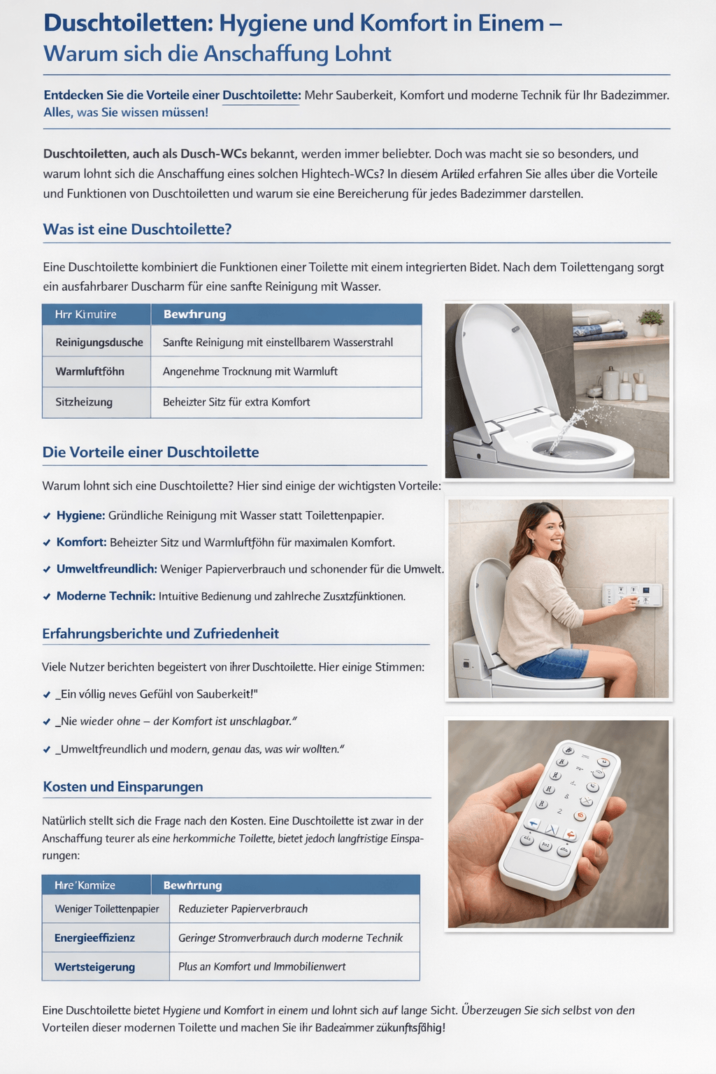 Duschtoiletten erleben seit einigen Jahren einen echten Boom – und das aus gutem Grund. Was früher vor allem in Japan verbreitet war, findet heute zunehmend Einzug in deutsche Badezimmer. Die Kombination aus Toilette und Bidet sorgt für ein völlig neues Hygienelevel und steigert gleichzeitig den Komfort im Alltag.